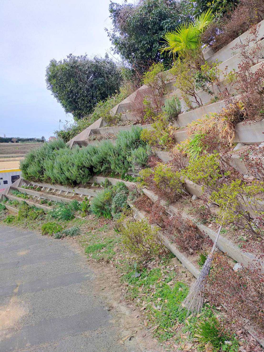 ボランティアで近くの公園の東側擁壁の世話をしています。もともとツツジが植えてあったのですが櫛の歯が抜けるようになくなって今はラベンダーなどを植えています。ラベンダーは丈夫ですね!水遣り全くしないのに大きくなって花を咲かせてくれます。草花というより喬木ですね!上の方にメキシカンセージを植えていて秋は紫の花をつけてくれていたのですがその花茎のみが残っていました。その剪定、急な角度のかなり高いところなので大変ですよ。それとキャットミントを植えていましたが、雑草に埋もれて伸びています。これも剪定!このキャットミントがあればなぜかナナホシテントウムシが来てくれます!最後に小菊!3時間程かかりました!昨年末にケース買いで買ったノースポール、28株あったのですが元気だけど全く目立ちませんね!