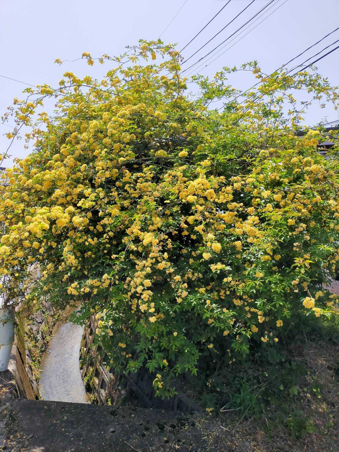 車で高速を使って1時間ほどのところに実家があります。今は誰も住んでいません!かなり広く300坪は超えています。樹木も梅の木を中心にいろんな木があります。泰山木なんか20メーター近くの高さがあるようです。ここの草取り、剪定が大変です!草取りはまだしも、樹木の剪定ともなると素人では無理ですね!それでも脚立立てて直径10センチまでぐらいの枝なら切ってます。問題は剪定した枝の処理。以前業者に頼んだときは軽トラに4回分1回7000円で持っていってくれました。なんでも自分の田んぼで燃やす、と言ってました。今は端っこに重ねています。私のように田舎に無人の実家持っている人多いでしょうね。みんなどうしてるのかな?世話はしなくても花は裂きますね。黄色の木香薔薇が満開でした。その他こんなものも咲いていました!