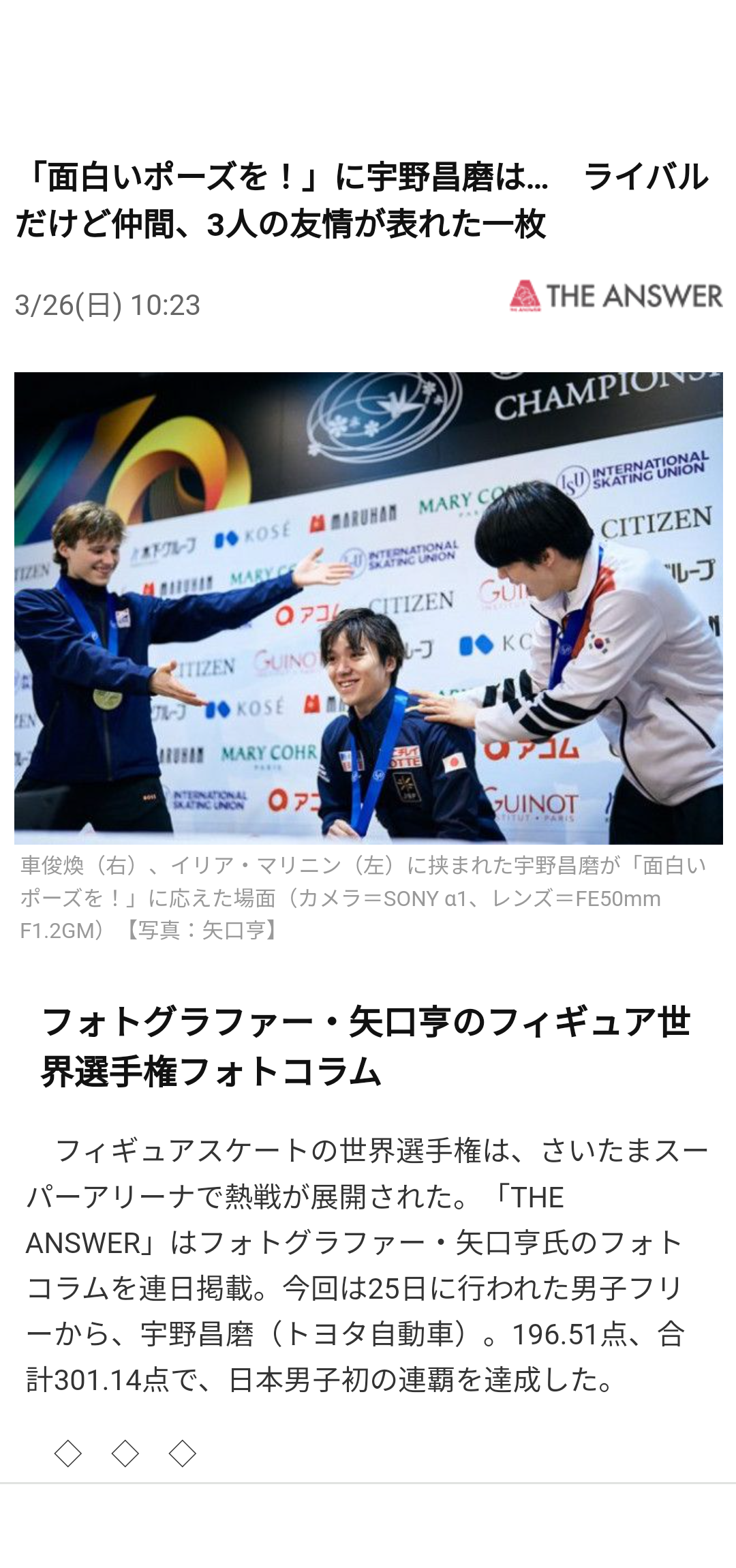 ■フォトグラファー・矢口亨のフィギュア世界選手権フォトコラムフィギュアスケートの世界選手権は、さいたまスーパーアリーナで熱戦を展開している。「THEANSWER」はフォトグラファー・矢口亨氏のフォトコラムを連日掲載。今回は24日に行われた女子フリーの坂本花織(シスメックス)。フリー145.37点、合…