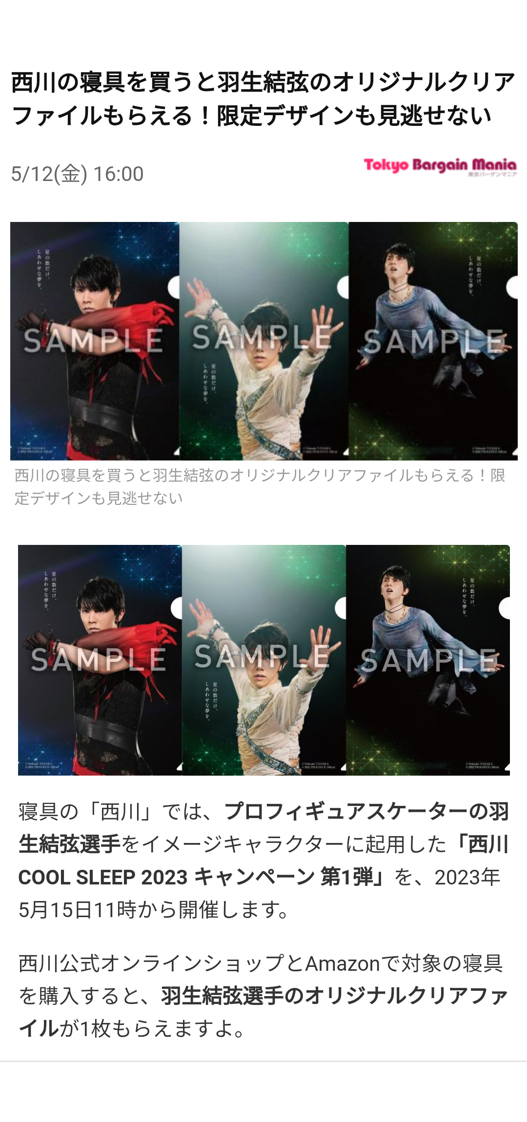 寝具の「西川」では、プロフィギュアスケーターの羽生結弦選手をイメージキャラクターに起用した「西川COOLSLEEP2023キャンペーン第1弾」を、2023年5月15日11時から開催します。西川公式オンラインショップとAmazonで対象の寝具を購入すると、羽生結弦選手のオリジナルクリアファイルが1枚も…