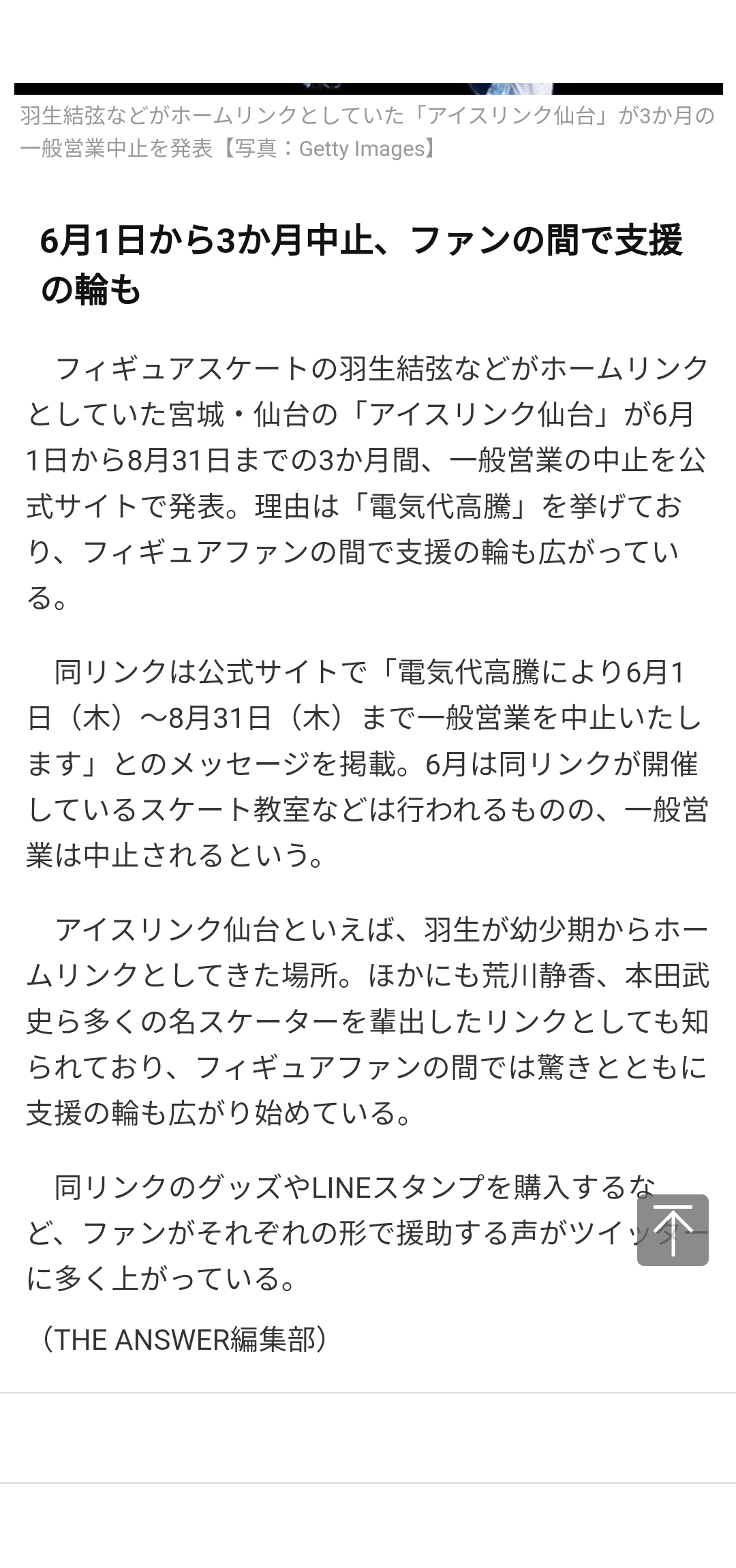 ■6月1日から3か月中止、ファンの間で支援の輪もフィギュアスケートの羽生結弦などがホームリンクとしていた宮城・仙台の「アイスリンク仙台」が6月1日から8月31日までの3か月間、一般営業の中止を公式サイトで発表。理由は「電気代高騰」を挙げており、フィギュアファンの間で支援の輪も広がっている。同リンクは…