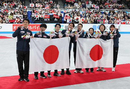 本日の写真 日本代表はグループナンバー「J-POPメドレー」でスペシャルな演技【フィギュア・エキシビション】4/16(日) 16:18配信◇16日 フィギュアスケート世界国別対抗戦 エキシビション(東京体育館) 今大会を3位で終えた日本代表のメンバー8人がグループナンバー「J―POPメドレー」を全員が参加して披露した。 世界国別対抗戦では日本代表がエキシビションでグループナンバーを披露するのは恒例。2017年の「PPAP」、19年の「平成J―POPメドレー」、21年の「We Are the World」など趣向を凝らした演技をみせてきた。 今回主将を務めた坂本花織(23)=シスメックス=がキス・アンド・クライでマイクをとって「この春、新たなスタートをする皆さんを応援したいという思いを込めて、8人全員で力を合わせて演技します。いざ、新時代へ!」と決意表明。日本代表のジャージーに身を包んだメンバーがリンクに向かった。 5曲を使ったプログラムでは、坂本と三原舞依(23)=シスメックス=の「新時代」にあわせたジャンプや、ペアの三浦璃来(21)、木原龍一組(30)=木下グループ=の「エール」に乗ったリフトなどそれぞれの選手が得意の技を披露。最後は「やってみよう」のメロディーに乗って、8人全員が肩を組んでから手を取り合うステップをみせて、スペシャルな演技を締めくくった。中日スポーツhttps://news.yahoo.co.jp/articles/e8c315ad3f5e7989b51071b8d2a39b2e962c8f29 佐藤駿、来季のSPは「少しタンゴっぽい曲」目標は「全部の試合でノーミスを」…国別対抗戦翌日のエキシビジョンスポーツ報知 / 2023年4月16日 14時52分 フィギュアスケートの世界国別対抗戦から一夜明けた16日、会場となった東京体育館で出場選手らによるエキシビションが行われた。 男子で、ショートプログラム(SP)11位、フリー8位だった佐藤駿(明大)は「Flower Dance by DJ OKAWARI」を演じ、トリプルアクセル(3回転半ジャンプ)、4回転トウループを跳んだ。 取材に応じた佐藤は、今季を振り返り、「今までの中でも一番いいシーズンを送れた」と総括。来季のプログラム構成について、「ショートは少しタンゴっぽい曲。曲とかは言えないけど、挑戦のプログラムになっているかな、と思う。フリーは今月か来月中にやっていきたい」と明かした。 今季は四大陸選手権銅メダルなどの結果を残し、来シーズンでは「ショートは僕の中ですごく大きな課題。全部の試合でノーミスするくらいの勢いで挑みたい」と力を込める。「今シーズンの順位よりも高い順位を目指して。そして全日本選手権で表彰台に乗ることができなかったので、来シーズンは乗れればいいかなと思っています」と見据えた。エキシビジョンで会場を盛り上げる日本代表チーム(左から)木原龍一、三浦璃来、坂本花織、三原舞依、友野一希、佐藤駿、村元哉中、高橋大輔 (カメラ・竜田 卓) 佐藤駿、来季のSPは「少しタンゴっぽい曲」目標は「全部の試合でノーミスを」…国別対抗戦翌日のエキシビジョン - 記事詳細|Infoseekニュースフィギュアスケートの世界国別対抗戦から一夜明けた16日、会場となった東京体育館で出場選手らによるエキシビションが行われた。男子で、ショートプログラム(SP)11位、フリー8位だった佐藤駿(明大)は「FlowerDancebyDJOKAWARI」を演じ、トリプルアクセル(3回転半ジャンプ)、4回転トウ…【全文を読む】 にほんブログ村あのスーツの男性は誰!?#世界国別対抗戦 で日本の主将を務めた女子の #坂本花織(23=シスメックス)が16日、会場の東京体育館でエキシビション前に取材に応じました。#Figure365 #フィギュア365 #日刊スポーツhttps://t.co/KZodUcinGs— 𝓕𝓲𝓰𝓾𝓻𝓮𝟹𝟼𝟻 (@figure365) April 16, 2023 🇺🇸🇰🇷🇯🇵 #teamcaptains #wttfigure #japan #tokyo #figureskating #worldteamtrophy pic.twitter.com/fN5IQ4riPD— Jason Brown (@jasonbskates) April 14, 2023 アメリカのイザボー選手とパシャリ!赤と青のコントラストがだいぶいい感じブイ!#国別対抗戦2023 pic.twitter.com/mlG1KhvndP— ゴーちゃん。 (@gochan_V) April 16, 2023