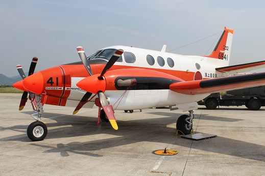 防府市北基地における画像です。写真は、海上自衛隊の飛行機です。プロペラが特徴であり、印象的です。赤色と白色のコントラストも良いです。