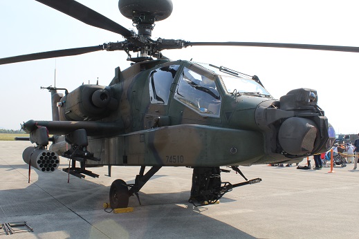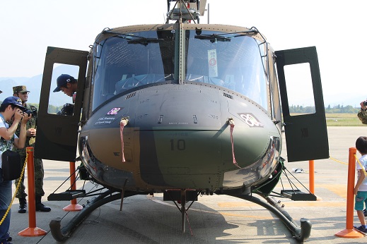 山口県防府市の自衛隊防府北基地で開催された航空ショーの画像です。写真は、自衛隊のヘリコプターの写真です。中の操縦席などを見学する子供達や大人で行列が出来ていました。