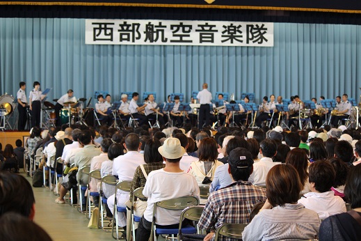 山口県防府市の自衛隊防府北基地における航空ショーでの一場面です。写真は、西部航空音楽隊による演奏状況です。立ち見が出るほどの満員状態でした。画像を拡大して、ご覧ください。