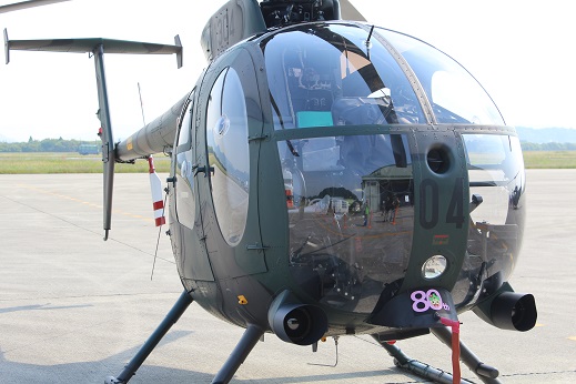 防府市の自衛隊北基地における航空ショーの写真です。ヘリコプターの中の様子も見て取れました。80周年を祝うシールも貼ってありました。画像を拡大して、ご覧ください。