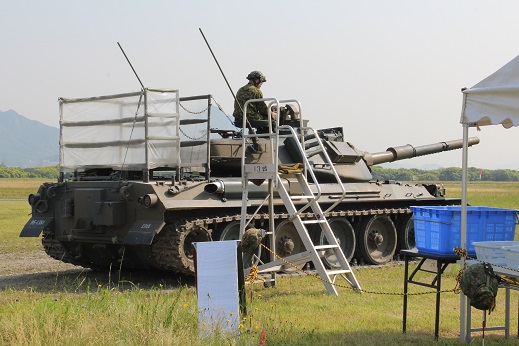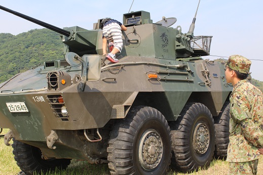 山口県防府市の自衛隊防府北基地で開催された航空ショーの写真です。自衛隊の特殊車両です。戦車と言った方が良いのでしょうか。子供達が次から次へと車両の上部に登って、記念写真を撮ってもらっていました。家族で楽しめるのが、航空ショーの良さです。