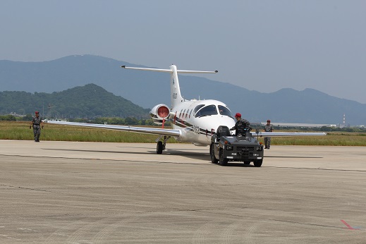 山口県防府市の自衛隊北基地における航空ショーの一場面です。飛行機の離陸前の準備の場面です。画像を拡大して、ご覧ください。