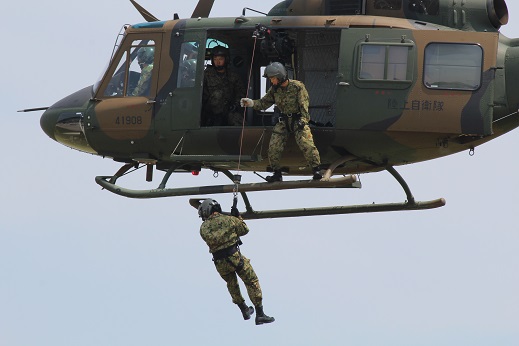 防府北基地で開催された航空ショーの一場面です。自衛隊のヘリコプターを使用した救助訓練の様子です。命がけの真剣な訓練です。画像を拡大して、ご覧ください。