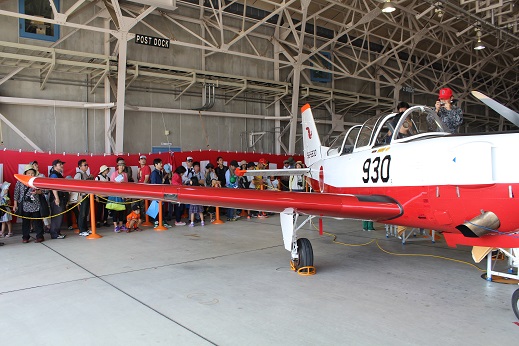 防府北基地の航空ショーの一場面です。写真は、訓練機の乗機体験コーナーの場面です。子供から高齢者まで、家族連れなどで、順番待ちの状態でした。画像は、拡大してご覧ください。