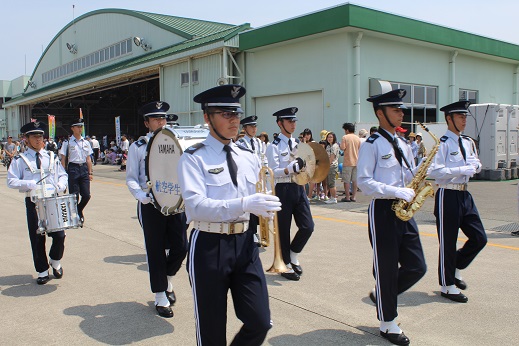 山口県防府市の自衛隊防府北基地で開催された航空ショーの一場面です。マーチングバンドというべきか、はっきりと分かりませんが、統一されたバンド演奏や一糸乱れぬ動きに観客も魅了されていました。