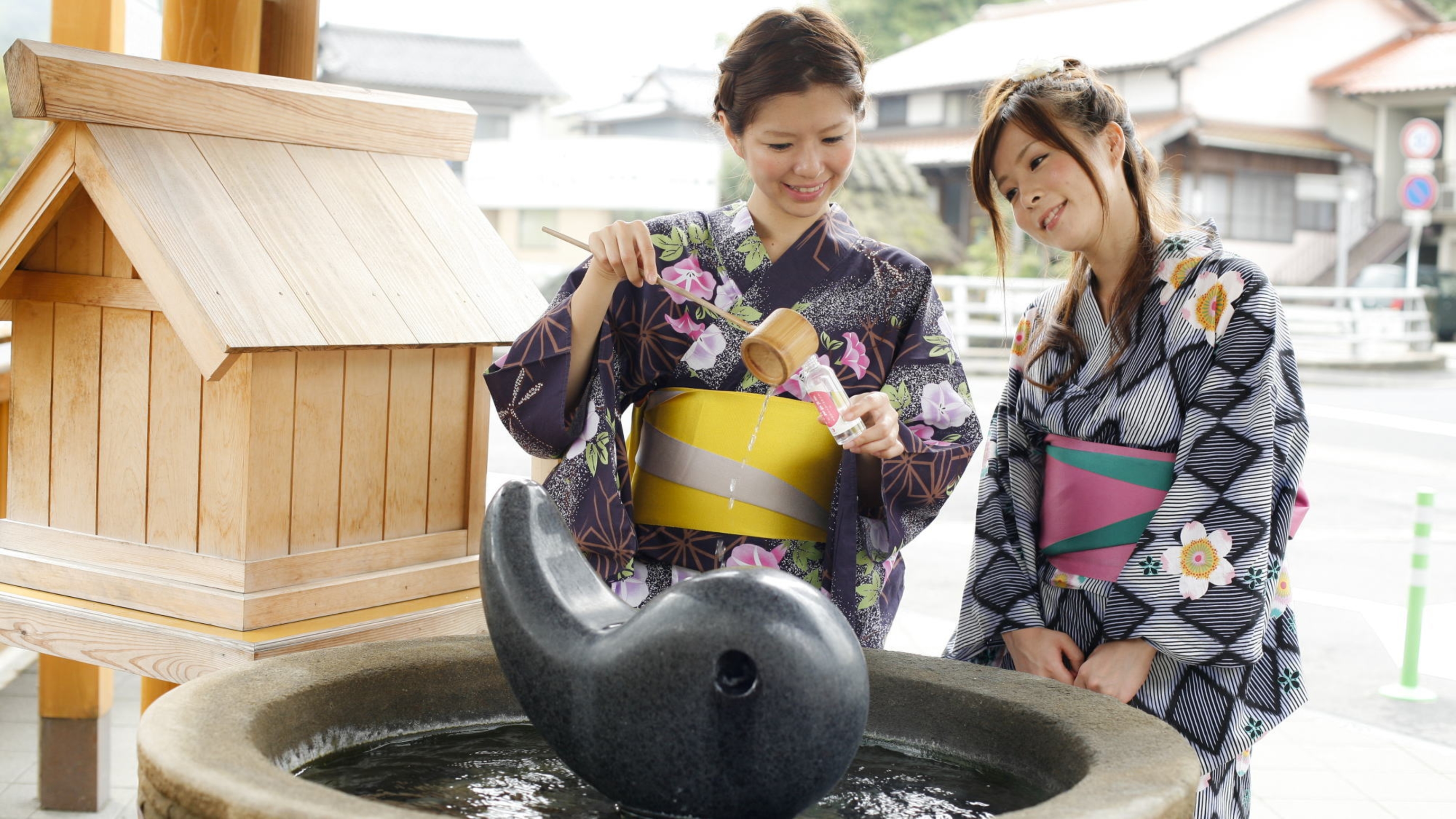 【湯薬師広場】たらいに入ったたらい湯。源泉をテイクアウトできる美肌スポットです