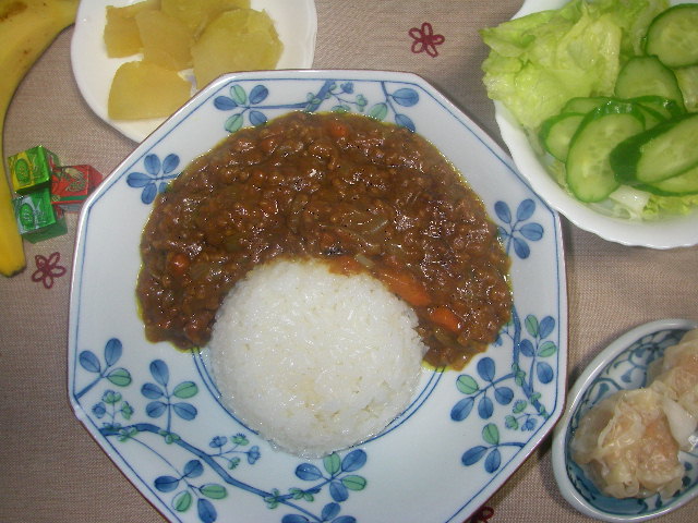 キーマカレー、シュウマイ(市販)、サツマイモとりんごの重ね煮(昨日の)、サラダ、チーズ、バナナ