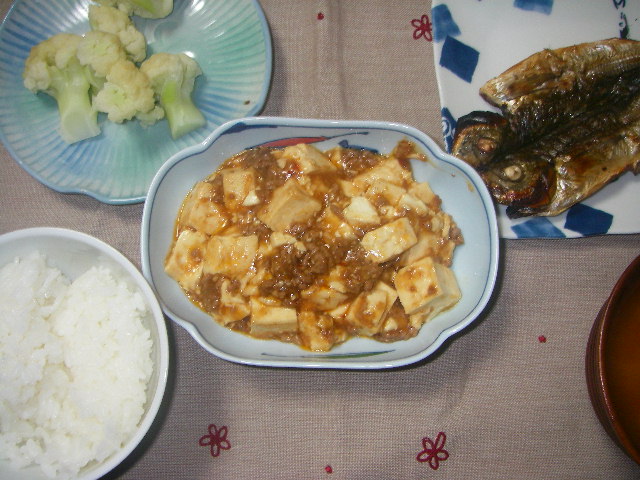 マーボ豆腐、鯵の干物、カリフラワー(とってもおいしかった)