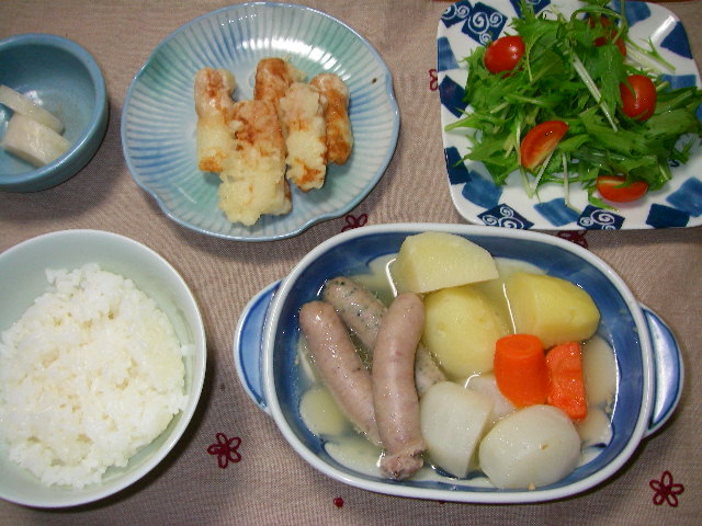 今日の晩御飯 スピードクッキング ポトフ料理名:ポトフ作者:横浜の浜っ子。■材料(3人分)ジャガイモ / 3個にんじん / 1本かぶ / 3個ウインナー / 9本コンソメ / 1個からし / 適量■レシピを考えた人のコメント美味しいかぶを美味しく。詳しいレシピはコチラ ポトフ、ちくわの天ぷら、水菜とトマトのサラダ、竹輪の天ぷら 25分で出来上がり。