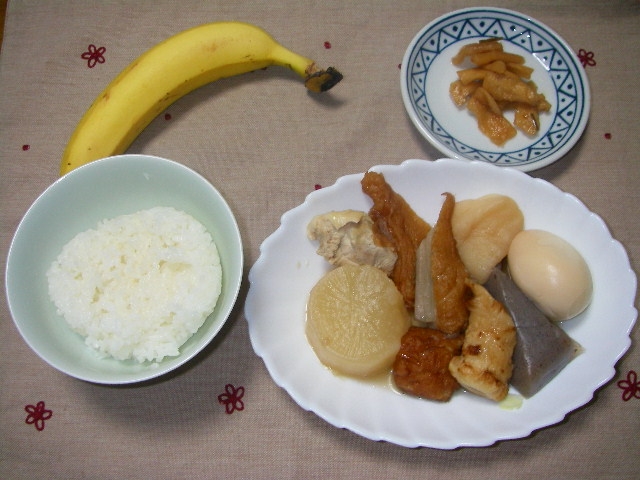 明日はお休みなので明日のお昼にも食べれるおでん。 今日は疲れているからちょっと手抜き。漬物の博多ごぶごぶは、美味しいよ。