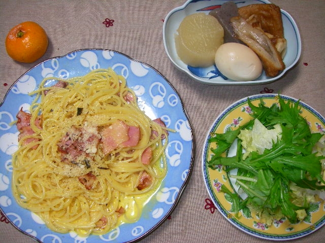 卵の黄身に生クリームとクレイジーソルトを混ぜて炒めたベーコンを入れて麺と混ぜてのりをかけて出来上がり。みかんは、楽天市場の熊本風土より今届いたみかん小さかったけどとっても甘かった。3キロ送料こみで980円は安い。