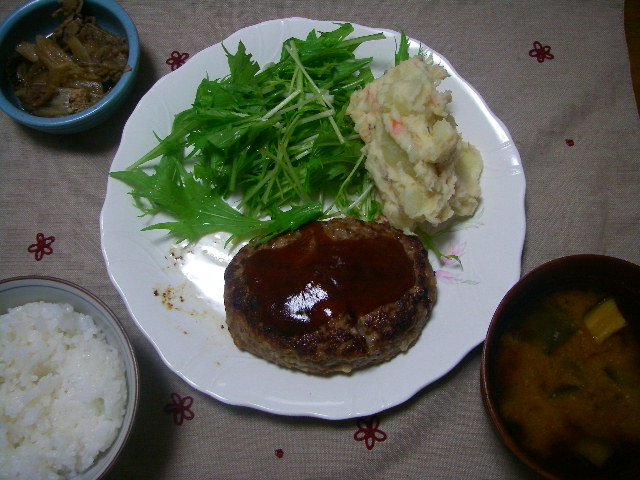 楽天市場の大阪のゆうぜんから購入したハンバーグ。大きくておいしいよ。ツナ入りポテトサラダ、味噌汁、昨日の牛肉とごぼうの煮込み肉汁じゅわ~!笑顔こぼれる牛100%!無添加牛生ビッグハンバーグ4個入り(1個190g)価格:930円(税込、送料別)