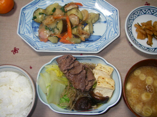 鮭のムニエル、焼きなす、ごぼうと牛肉の炒め煮、味噌汁、みかん
