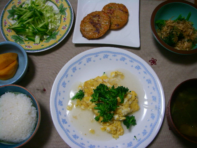 卵のあんかけ、さつま揚げ、ほうれん草のおかか和え、生野菜、味噌汁、柿