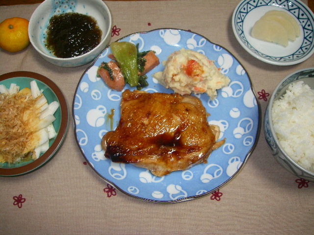 鶏の照り焼き、青梗菜炒め、ポテトサラダ(昨日の)、長いもののおかか和え、もずく、漬物、みかん鶏の照り焼きは、何もつけずに両面焼く。ほぼ焼けたら、火をとろ火にして砂糖、しょうゆを入れてからめる。いい色が付いたら出来上がり。