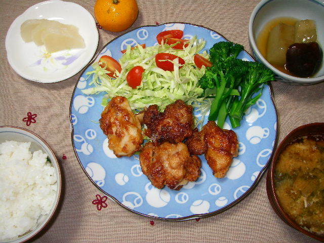 いつものから揚げもちょっと変身料理名:韓国風から揚げ作者:横浜の浜っ子。■材料(3人分)鶏もも肉 / 2枚キムチの素 / 40gくらい片栗粉 / 適量油 / 定量■レシピを考えた人のコメントキムチの素が残っていたので。今日の夕ご飯 韓国風から揚げ、スティックブロッコリー、冬瓜の煮物、味噌汁、漬物、みかん詳しいレシピはコチラ