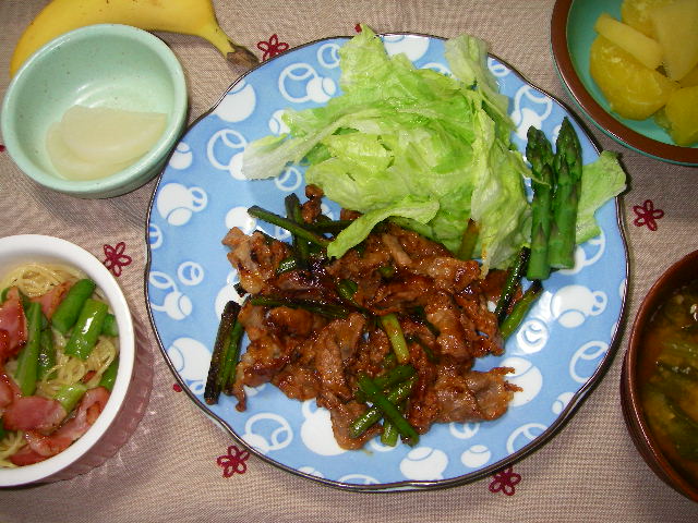 肉炒め、アスパラ、サツマイモとりんごの重ね煮、ベーコンとアスパラのスパゲティー、味噌汁、バナナ、漬物