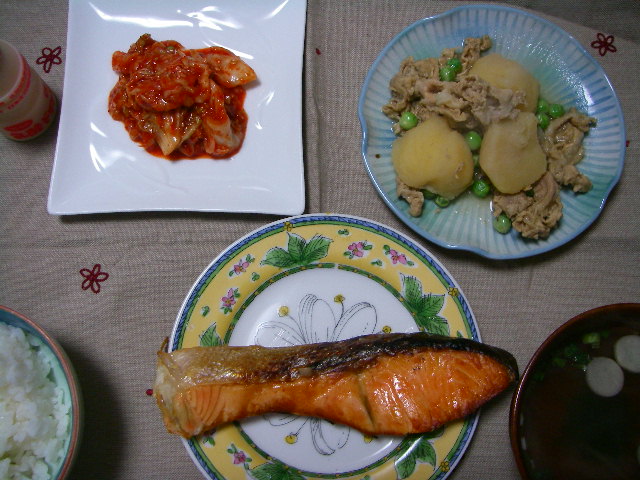 鮭の塩焼き、肉じゃが、キムチ(ギャルそねの おいしい)、味噌汁、ヤクルト