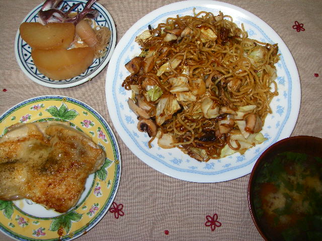 いかとキャベツの焼きそば、鶏の照り焼き、大根とむすびこんにゃくとイカの煮物、味噌汁