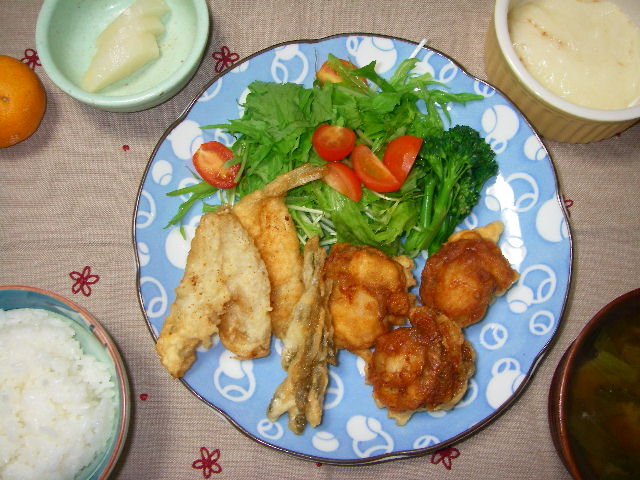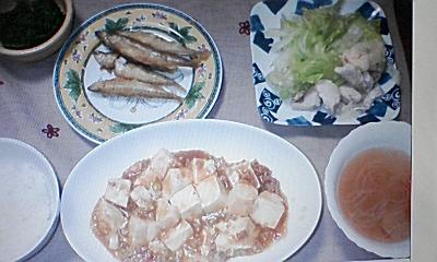 マーボ豆腐 チキンサラダ+ポテトサラダ(ポテトサラダは市販品)(鶏肉は茹でて汁はスープに)にんじんと春雨のスープわかさぎのフライ(わかさぎは今が旬。30尾くらいで200円 北海道産 カラッツとあげた)春菊のおひたし(意外だが美味しい。くせがあるが、くせになる味)野菜がすくなそうだったので今日は市販品のポテトサラダを購入。デジカメで撮影したが、容量が大きすぎてだめ。食べてしまったのでパソコンの画像を携帯で撮影。うー カメラの取り込み難しすぎる。