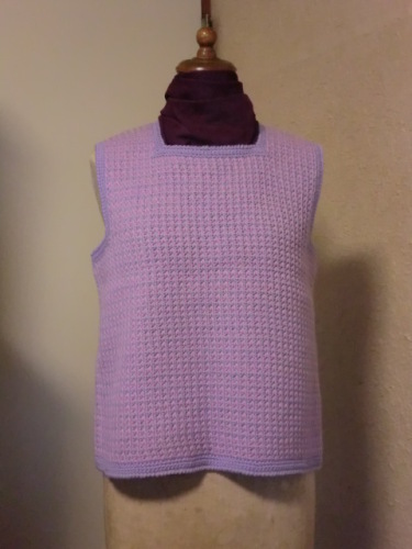 高校生向けのアフガン編みベスト、実は、私がいなかった回に、裏目が難しくて編めない生徒が多かったため、編み地を易しくアレンジしたようで、いちおうその模様でもサンプルを作って持って行きました。編み地のアップ↓使用糸:プレジデント 純毛合太 使用針:アフガン針8号製図は思いっきり簡単になりました。衿ぐりも袖ぐりもカーブなしのスクエア。でも、これ、実は、ちょっとワケありなんです…編み地をよーく見ると、ピンとくる人はピンとくるでしょう。私も実際に編んでみてハッと気付いたのですが…(アレンジ後の編み図を見た段階で気付くべきでした)「アフガン編みいろいろ」 シングルフックとダブルフック文化出版局何がワケありかって?編み地が斜傾するんです。スチームアイロンをかけて編み地をしごくことによって、ある程度は解消されましたが…アフガン編みやかぎ針編みでは、斜傾はたまにあるので、模様をアレンジするときは注意が必要です。
