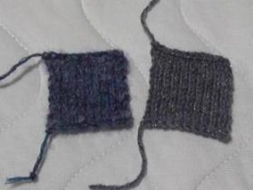 昨日の続きです。プルオーバーの身頃に使う糸、もうひとつの候補は、リッチモア「オーロラ」。これは、以前、リッチモアの新商品展示会に行ったときに、「パーセント・グラデーション」とともに特に気になった商品。基本的にはどの色もグレー系の糸がベースになって、そこに色糸とラメ糸が絡まっている構造。冬の銀世界を思わせるような、寒色系中心の色のバリエーション。展示会で見たときは、ラメもそんなにきつくなく、メンズにも使えるかも、と思っていたのですが…右がオーロラ、左が昨日紹介したデッラルバ。実際に買って編んでみると、結構ラメがキツイねぇ(写真じゃわかりにくいですが)。ダイヤモンドダストのような印象で、とってもおもしろい糸だとは思うのですが、今回の目的にはちょっと適わないようです。部分的に使う分には、メンズでもいけそうな気がしますが。【ラメ糸とプリント糸を撚り合わせたファンシーヤーン】リッチモア毛糸 オーロラ