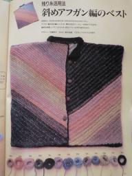 昨日登場したななめ編みのプルオーバーは、棒針編みで作っています。ななめ編みの作品をかぎ針編みで作ろうと思うと、かぎ針編みはわりと動き(編み進み方向)の自由度があるので、さほど難しくはなさそうな気がします。では、アフガン編みは?アフガン編みは、往路で全目が針にかかるので、編み進み方は基本的には棒針と一緒。ですから、設計や技法の難しさは棒針編みと同程度でしょうか。ただ、アフガン編みは編み地の右側と左側で増減技法が異なるので、その意味では棒針よりは難しいのかも。じゃあ、過去にアフガン編みのななめ編みで作った作品を、誰か発表していないかなぁ?いろいろ探してはいるのですが、そもそもアフガン編みの作品自体が少ない。そんな中、先日、よく行く古本屋でひとつ見つけました。(「Amu(アムウ)1995年7月号」24ページ、日本ヴォーグ社より)「残り糸活用法 斜めアフガン編のベスト」。プレーンアフガン編みのななめ編みで長方形の編み地を作り、脇とじと肩はぎをしただけの、仕立て自体はシンプルな前開きベスト。ここでは、ゲージをとって編み目比出して割出しをして…というのは省略して、編み地が直角になっているかを編みながら確認しています。しかも、この作品のもう一つのテーマが「残り糸活用」で、13種類もの残り糸(5~75g)を順々に使って、グラデーションのような効果を出しています。材質も太さもバラバラですから、ここではゲージをとって割出しをすること自体があまり意味がありません。これは面白いアイディアニットですね。では、このななめアフガン編みを応用して、もうちょっとシルエットや着やすさをプラスしたウエアは作れるでしょうか。袖ぐりや衿ぐり、肩下がりなども、割出しすることは可能だと思います。ただ、心配なのは、編み地の伸縮。この斜めアフガン編のベストの但し書きにも、「見幅寸法は減目に入るとつまる可能性があるので1~2cm位多くしておいた方がよい」「プレーンアフガン編は傾斜しやすい編み地なので、とじ・はぎの前にピン打ちをして蒸気アイロンをかけて形を整える」とあります。まっすぐ編みでは気にも留めなかった部分で、いろいろと問題点が浮上してくるのでしょうね…「文部省認定 毛糸編物技能検定試験 受験の手引(1級)」にも、ななめ編みをする際の注意点がいくつも記載されています。「斜め編の傾斜の度合いは、作品の感覚面でも影響するが、実際に編む場合には、素材と編目の伸縮する度合いと、傾斜の角度の関係を考えて、形や寸法の狂いがないようにすることが必要である。横長の形になればなるほど、横に伸びる率が多くなるため、伸びる分量を考えて、目数の計算をしたり、横に伸びにくい編方にしたり、無理のないデザインにすることが必要である。」このあとに、傾斜の角度により目数や段数を何%引いたり足したりせよ、という説明があります。アフガン編みは伸縮が比較的少ないとは言え、このあたりを気にしておかないと変なものができてしまいそうですね。さらに、「えりぐりは斜めの傾斜度によって、伸びのきく場合もあるが、きかない場合もあるので、頭の入らないえりぐりにならぬよう注意すること」だって。製図どおりに編めても、いざ着てみると「?」というようになってしまう恐れが大ということでしょうか。これは、ななめ編みの試作をいくつか作って、感覚をつかんでおかないと、いきなり良質の糸で編んでしまって「もったいない」ということになりかねなさそうですね…手編みの本基礎&技法【ヴォーグ社】アフガン編み「記号の見方から作品づくりの仕上げまで」