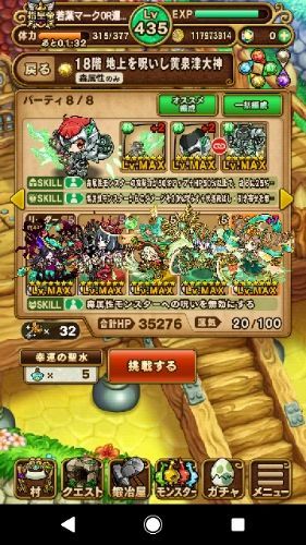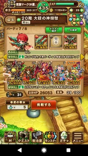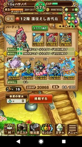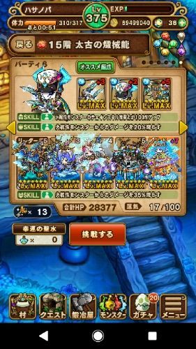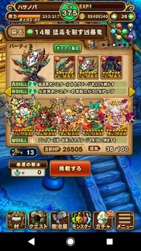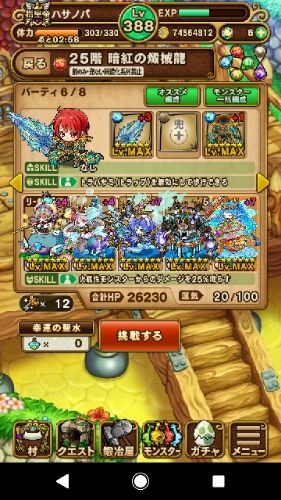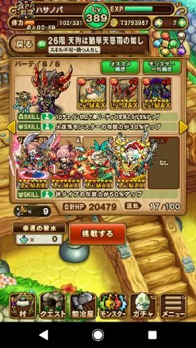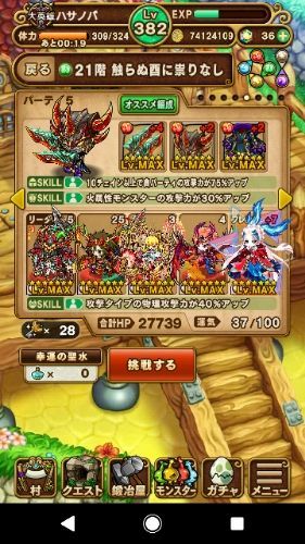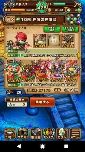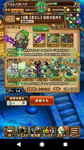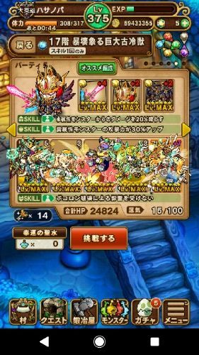 ムスペルヘイム 21階 森属性と水属性の敵が出てくるが、水属性は倒す必要はない。 そもそも水属性のモンスターはダメージが殆ど入らないので倒すのが難しい。そして少しダメージを入れてしまうと暴走状態になって大ダメージを受ける。 そのため、水属性には触れないように倒すか、全てを1ターンで倒す勢いでクリアする。 パーティー装備 ギルガメ 真田幸村 シンデレラ アンラマンユ フレンドは プロミネンス双剣 プロミネンス兜 ハロウィン鎧 変換からワンパン撃破するつもりで、攻撃力upするギルガメ、後は変換。 装備はコンボ稼ぎに双剣、後は攻撃力up。 フロア1 フロア2 フロア3 撮り忘れ フロア4 ボス部屋 全てワンパンでいけました。