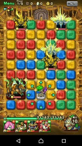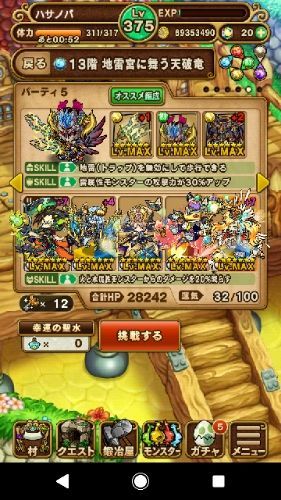 ムスペルヘイム 23階 全3フロア 相手の属性が変化する 敵はドラゴンタイプのみ パーティー装備 関羽(ドラゴン軽減 火傷) エルファバ(変換 毒) ウリエル(痺れ) アルファ フレンド シンラ(変換 回復) 風雷鬼神の双剣 アースガルド兜(軽減) アースガルド鎧(攻撃up) 属性が変わるとダメージが入り難いので、火傷と毒をパーティーに入れました。 この階のモンスターは攻撃タイプと神タイプを弱点としているので、できるだけその2タイプを入れるように選びました。 関羽は限界突破して火傷確率をあげています。 フロア1 黄龍とドラゴン。 ドラゴンは雷属性から森属性に変わる。 黄龍は暴走するまで最初の位置から動かないので、直接攻撃が当てれない。 フル変換して痺れ、毒、火傷を入れて、地道に倒していく。 フロア2 ガーディアンドラゴンとドラゴン。 ドラゴンは森属性から雷属性に変わる。 ここも変換して周りのドラゴンを巻き込みながらチェインでガーディアンドラゴンを倒す。 ボス部屋 HP残量で二回変化します。それにともない、属性も変わります。 属性が変わるとダメージが入り難いので、雑魚を巻き込んだコンボで稼ぐか、火傷、毒でダメージを入れながら撃破。