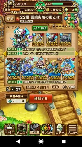 19階 吹き飛ばせる岩 水属性呪い 鎧なし 装備 パーティー 呪いを無効に出来るなら水属性パーティーが良いだろうけど、無いので火属性。 水属性以外なら呪われない。 兜は無難に軽減。 武器はシャーマンキングのコラボの時の剣がチェイン発動数が少ないのでオススメ。無い場合でも水属性以外の剣が良いかも。理由はフロア4のミクトが水属性のシールドのせいで吹き飛ばせないから。 パーティーは変換を可能な限り多め。 フロア1 ここは問題なし。出来ればスキルは温存したい。 フロア2 のんびり整地してるとやられる。変換して上から下へ吹き飛ばし岩に当てる。 だいたい4個分の岩に叩きつけると1体倒せる。岩が無くなった場合、一番下の列を踏めば岩を出せる。 フロア3 この階最大の難所。柵から出てくるモンスターの一撃は重すぎるので、理想的なのは右上の柵を塞ぎながら右へ吹き飛ばし続ける事ができればベスト。 フロア4 このフロアの為に武器は水属性以外の剣がオススメ。 水属性だとシールドが無くなるまでミクトが吹き飛ばせないから。 ボス部屋 ここもやはり吹き飛ばしてぶつける。アザゼルと立ち位置が入れ替われる(自分が上)とやり易くなる。 ボンバ兵も倒してクリアとなる。