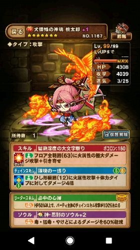 極幻 桃太郎 HPが50%以上あればパーティーのチェインが外れなくなるという特殊なリーダースキル。 スキルも全体攻撃+引き寄せという変わったスキルを持っている。 どちらも特定のダンジョンではかなり役立つスキルなので火火の属性がオススメ。 チェインスキルが攻撃+回復なので、自前で回復手段がないならばこちらもありかもしれないけど、リーダースキルが剣のチェイン発動数を1減らすという変わり種。 チェイン発動数が4の剣の時にリーダーにしたらたった3マスで吹き飛ばせる。 ただ、使い道が浮かばない。