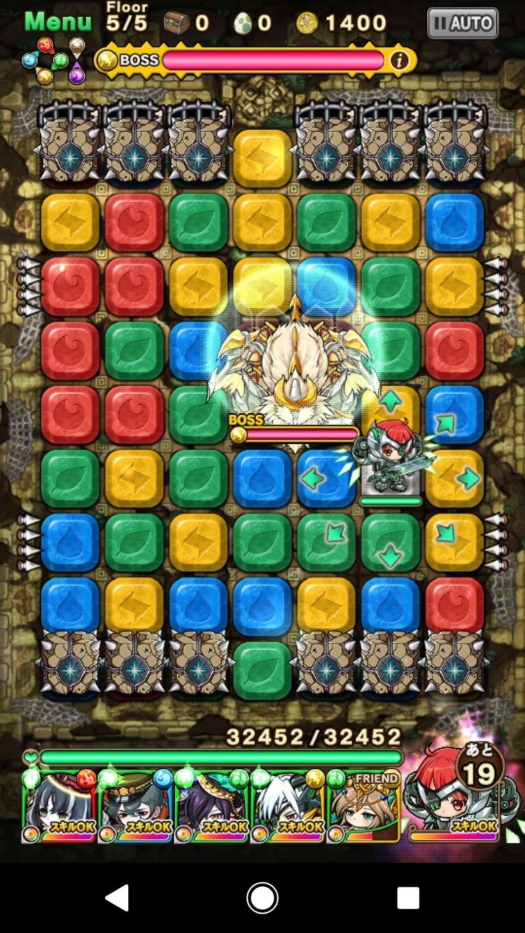 アルフヘイム 16階 タイプ制限 (攻撃 回復 ドラゴン 神) ダメージ床 パーティー 装備 ルージュ(ダメージ床対策 回復) 真田(変換) エクスかリバー アリア(攻撃タイプのチェインスキルが二連) フレンド セツナ(変換) フロア1 雷と森のダメージ床。 両サイドの敵は中央のサイクロプスを倒せば消える。 フロア2 緑のダメージ床が多め。ルージュのリーダースキルで問題はない。 フロア3 雷のダメージ床が多い。ルージュのリーダースキルは森属性しか無効にしないので、慎重に歩かないとやられる。 フロア4 ここも雷のダメージ床が多い。フレンドをマーズにしてリフレッシュすればよかったと後悔… ボス部屋 森のダメージ床がほとんどだけど、両端にある穴を踏むと雷のゴーストも出てくる。 かしましツリーは回復してくるから先にコイツを倒す。 変換でオバケを倒しながらのチェイン攻撃でヒュドラを削る。 意外と盤面も狭いし、ボスも固いので苦戦したがクリア。 アルフヘイム 17階 3フロアのみ。 フレンド枠なし。 吹き飛ばされないようにしないと即死。 鎧で吹き飛ばしを予防。 フロア1 回りに居るモンスターの攻撃力が高く、攻撃範囲に入ると即死する。範囲は狭いので、吹き飛ばし対策さえ後は注意するだけ。 フロア2 ここも吹き飛ばされて回りに居るモンスターの攻撃範囲にはいると即死。 ボス部屋 回りの即死モンスターはここにも居る。 範囲に入らないようにチェインを着地させる。リーダースキルで軽減してるので、ダメージは耐えられるレベル。軽減してないと数回に一回の攻撃は即死級かも。 ボスは状態異常が一切入らない。 地道に変換→攻撃を繰り返し撃破。