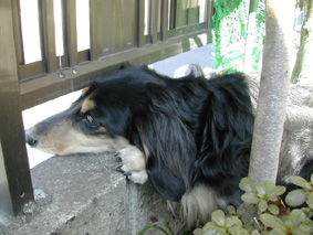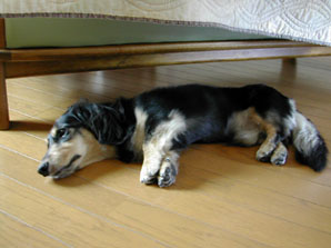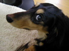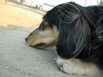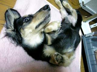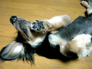 ミニチュア・ダックスフントって、みんなこんな格好するんでしょうか?上半身はこっちだけど、下半身はあっち行っちゃってるよ~!!でも本人はいたって普通。すごいリラックスしちゃっています。おかしな犬(?)です・・・。