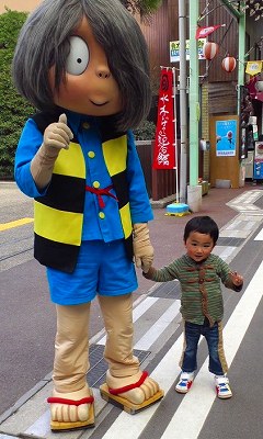 4月上旬の 颯くんパパとママと3人で 鬼太郎電車に乗り 我が家から30k余り 西の境港まで 小旅行をしてきました鬼太郎ロードでは 鬼太郎 ネズミ男 一反木綿etc 大興奮だったそうです帰ってからも 興奮冷めやらず「鬼太郎 いたねぇー たのしかったねぇー・・」と 疲れて眠りについたそうです2月 宮崎の巨人キャンプで 横綱 「白鵬」に抱っこしてもらったのですが 大泣き颯くん いわく 「ちょんまげ こわかった・・・」だったそうです「横綱 には 申し訳なくって・・・・」と両親颯くんには 妖怪より ちょんまげが 苦手のようです
