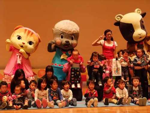 昨日(21日) 当地の隣 鬼太郎の市 境港市で「NHKおかあさんといっしょの ぽこ・ぽっていと小劇場」観覧に出掛けました。 テレビで毎日見ているお友達?に最初は バーバに抱っこされていましたが その内 つられてか 舞台からうながされてか 床に降りて踊り 舞台と共に大きな声で歌って楽しんでいました。どんな感じなのかなぁー 不思議に思っているのかなぁー と思いながら 私も孫と一緒に楽しみました 向かって左から4人目 ピースをしているのが 颯くん 先月満3歳の誕生日をむかえました。最後に舞台に上がり写真撮影したのですが・・・泣くかなぁー? と心配しましたが大丈夫でした。「なかなかったねぇ~ もう3歳だから・・・」って帰りに パパがわざわざ 遠回りをして 今話題の メロディーロードを走ってくれました。「げ・げ・げげげのげ~~♪ みんなでうたお~げげげのげ~♪・・・・」時速50キロで走ると 道路が歌うのです。これに1千万円?とか 3年くらい持つそうです。楽しい道路ですが もったいないなぁー なんて