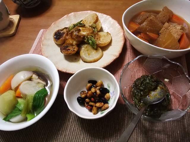 暖かい冬です。 このまま春になるとは思いませんが とても 気持ちの良い日が続いています。 また 寒気が下りてきているようです。 昨年 カメムシが たくさん見られました。 そんな年は 雪が多い・・・と云われていますが 良いのか悪いのか 予想外の冬です。 普通の気候になってくれるほうを 願います。 初物の「ふきのとう」を見つけましたので さっそくフキノトウ味噌でいただきました。 早いものは 美味しくないのですが そこそこ香りもあり 美味しく春をいただきました。 夕食は ★大ぶり野菜の ゴロゴロスープ 小かぶ コールラビ 玉ねぎ 椎茸 にんじん 昆布 チンゲン菜 ★ 小かぶのステーキ 味噌ソースかけ ★煮物 大根 人参 がんもどき 茶豆 ★酢大豆 5色大豆 自家製リンゴ酢 ★フキノトウ味噌 ★人参100%ジュース 早生のふきのとうです。 この時期のものは やや大ぶりです。 5本だけでした。 まだまだいただける筈です。 畑から 収穫したばかりの野菜たちです。 小かぶ(あやめ雪) コールラビ チンゲン菜 人参の甘みが 格別です 我が家も 人参を作っているのですが 人参の専業農家さんから 出荷出来ないものを大量にいただきます。 一度に 20本位 ジュースにして 贅沢に飲んでいます。 これも出荷したら? というのですが 捨てたほうが・・・・と 大変な思いで作付されるのですがねぇー 当方のように 楽しみで野菜つくり とは違いますから ありがとうございます ご・ち・そう・さま・・・・!!(^^♪