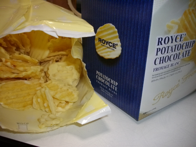 北海道物産展まだまだすごい人気の ★ROYCE★ロイズのチョコレートコーナー定番のロイズ ポテトチップチョコレートを買おうと行列に並んでたら初めて見るはこが…ホワイトチョコがついたポテトチップ 新作じゃがいもの味がすごいいままでのポテトチップチョコレートよりもうまいこんなにじゃがいもの味がしっかりわかるポテトチップはないような ホワイトチョコがでしゃばらずいい感じでロイズ マシュマロチョコレートミルク珈琲ロイズ チョコレートドリンク・ペースト