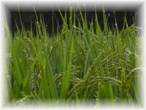 今日も暑い一日です。真っ赤な太陽が、夏だぞ~~~! と言わんばかりの暑さですネ。 朝の散歩も太陽に負けています。暑い...この太陽の恵みをいっぱいにもらって育っていますね、稲穂。 朝露と真っ赤な太陽が大きく育てています。 稲穂が重くなってきたようです。 ふと上を見ると、小鳥がついばんでいます。 何の木の実でしょうか。美味しそうです.... 大きな花です。まるでハイビスカスのように咲いています。 畑の中で太陽に向かって咲いています、ムクゲ。 (※後ろにはカンナが咲いてます)