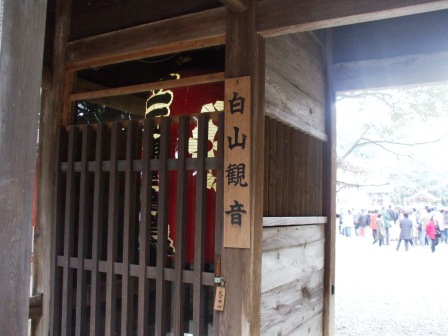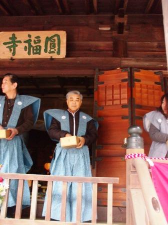 白山観音・円福寺に行ってきました。裃・袴を着させて戴きました。お札を巻いたヒバの小枝を護摩炊きしながら祈祷しても貰い、その後豆まきでした。写真は女房が撮ってくれました。 「鬼は外」は言わず「福は内」を正面、左・右に3回ずつ撒きました。 近くの幼稚園児もマメを撒いていました。前にも掲載した観音堂です。結構人出がありました。