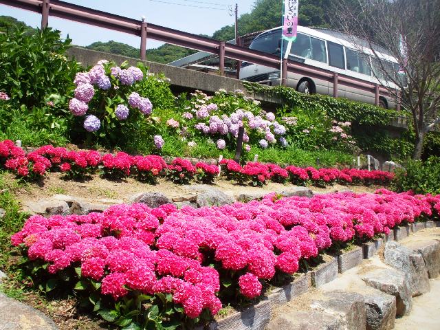 久しぶりの遠足で、6時前に目が覚めてしまいました~出発は9時だったんですけどねぇ~バスの中ではお茶も出ないと聞いていたので、冷凍して置いたポカリスエットを2本準備。8時40分に家を出て集合場所に。3箇所から分散乗車だが出発点は5名だけ。予定より5分ほど早く出発。途中2箇所でも遅刻者無しで、順調に進みました。途中上郷サービスエリアに寄ってトイレ休憩。10時には岡崎ICを出て一路形原温泉へ。途中の道路が混んでいて30分以上掛かってしまいました。西浦温泉にあるホテル「和のリゾートはづ」の所有するマイクロバスなんですが、あじさいの里の一番よい所までノンストップで入れました。写真整理は明日になりますが、期待を持たせたので取り合えず一枚だけ掲載します。上に写っているマイクロバスに往復ともお世話になりました。西ゲートを入ってすぐのところです。入園料は300円でした。池の周りを一周して40分くらい掛かりました。もう少し時間が欲しかったですね。紫陽花を堪能した後は西浦温泉で温泉と昼食&宴会。宴会と言っても男性5名女性19名なのでアルコールは少なくカラオケ大会でした。歌はまるっきりダメな私は聞き役&拍手係りです。カラオケクラブにも入ろうかなぁ???帰りは形原漁港の山本水産に寄って魚介類のお土産を購入して帰途につきました。帰りは皆さん疲れて居眠りしている人が多かったですね。5時前に全員無事出発地点に戻りました。家に戻って少しごろ寝でした。明日も午前中は囲碁クラブなので、写真掲載は午後に成りま~す。