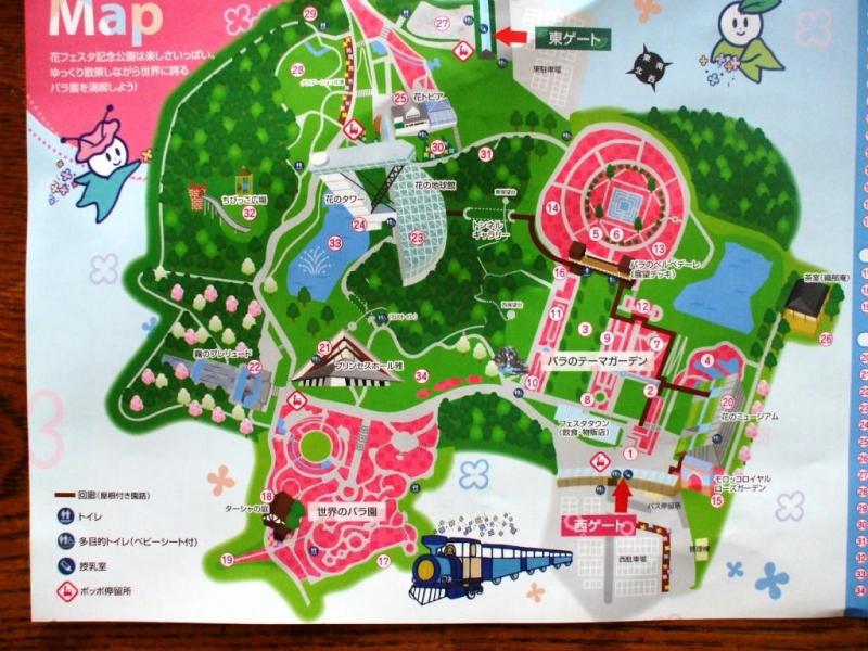 花フェスタ写真1 花フェスタ写真2 花フェスタ写真3 皆さん客が少ない事を気にしていらっしゃいましたが、庭園風のバラ園はバラのテーマガーデンの方がじっくり見ることが出来ますのでこちらの方が客は多かったですね。売店やレストランもこちらに集中しています。世界のバラ園を見たのは9時過ぎから10時半頃だったので、時間が早かったこともあります。世界のバラ園は東ゲートから入っても、西ゲートから入っても一番奥に位置します。今日は西ゲートから入った所にあるバラのテーマガーデンをテラスガーデンと展望デッキから撮った写真です。先に花のミュージアムが見えます。中には入りませんでした。こちら側に青いバラの庭が有ったんですが行きませんでした。ロイヤルローズガーデンです。テラスガーデンから2枚ほど。案内図右上に見えるフォーマルガーデンを展望デッキから何枚か撮りました。此処だけでも入ったら1時間では出て来れませんね。歩く元気が無かった??歩いてきたデッキを入れて撮りました。デッキは200mくらいの長さが有りました。此処でデッキからの写真は終わりです。デッキの終わりには・・何の花でしょう?この先はトンネルを抜けて初日に載せた花のタワーに行けます。これで行った所の写真はほとんどですが明日は残りのバラのズームアップとバラ以外の花も載せます。