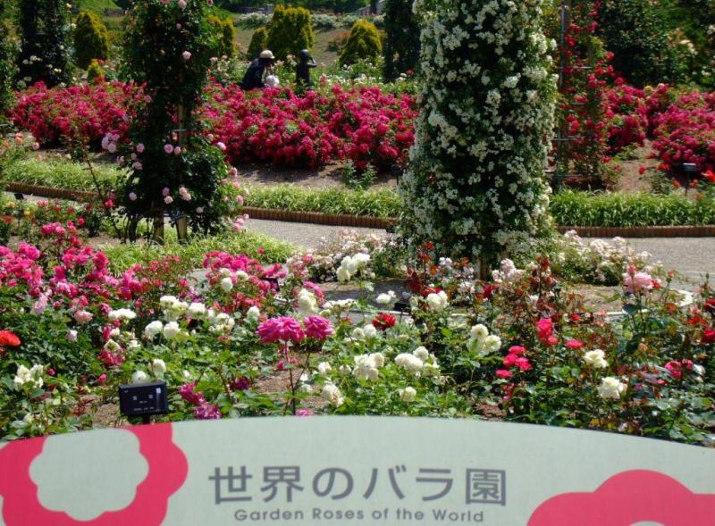 花フェスタ写真1花フェスタ写真2 お待たせしました~案内図左下の「世界のバラ園」の中から何枚かのスナップショットです。コメントは有りません。とにかくバラ、ばら、薔薇、ばら、バラです。歩いているだけで香りに包まれます。バラ園の右側に花見の丘が有り上からも撮りました。20mくらい上がったところに展望台があります。西ゲートに向かう手前の高台に休憩所が有り、ここからも世界のバラ園の全体が見られます。此処だけでも全部見ようと思ったら1時間では足りません。案内図のピンクのゾーンがバラ園になっています。ホントに広いですねぇ。明日はバラのテーマガーデンを展望デッキからの写真で掲載します。