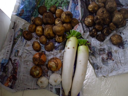 今日は腎臓病検査の日で9:30が予約時間なので8時前にでかけました。が、やはり早い時間だと道路が混んでいました。R19に出るまでに信号待ち5回の渋滞に捕まってしまい、途中から何時もと違うR155に入ったのがまたまた失敗。こちらも途中で信号2回待ち。結局病院に着いたのは9時前で何時もと大して変わり無かった。採血順番も40番でこの前より大分遅かった。結果は、Cre3.5で改善。Hb11.7で悪化。HbA1c7.0で改善。前回高かったLDL-Cが116と正常値に下がって居たので良しとしますか。前回投薬日数を間違えて余分に頂いていたので、今回は2週間分に減らして頂きました。こちらから言おうと思っていましたが、先生が先に気がついたので余分な事を言わなくて済みました。病院の帰りに車で10分位のところに有る憩の家に行ってみることにしました。事前にGoogle地図で印刷して行ったのですが建物近くの道は車一台通ると一杯になる程の狭さで、迷ってしまいました。掲載は後日になりますが、憩の家のリストの最初に載っているのは、最も古い建物だからの様です。かなり古い建物で耐震強度が心配になりました。で掲載は後日に成ってしまいますが、行った場所は県道25号線の桃山信号を入ったところにある桃山憩の家。ん?桃山?桃山?えっ!えっ!昨日の桃太郎神社に出ていた桃山かぁ? んな訳ないですよぉ~此処に山は有りませ~ん。家に戻ったのは12時前。昨日の菖蒲を掲載しようとパソコンを開いたら、ご不在連絡eメールが入っていました。クロネコヤマトの会員登録してあるので不在配達の時配信されます。何かなぁと思って再配送を依頼しました。で届いたのはこれにととらさんから産地直送の大量じゃが芋、にんにく、玉葱、大根でした。 有難う御座いま~す。ブログ開いて、ととらさんからのメッセージが届いていたのに気がつきました。メッセージはあまり気にして見ていなかったので、メール通知をonにしました。2時過ぎに女房が帰ってきて、大量のラッキョウを購入してきました。息子に頼まれた、オークションで売れたパン焼き器を郵パックで送ってから、延々と3時間以上ラッキョウの薄皮剥きをお手伝いしました。今迄は1人でやっていたんだよ。大変でしょう。と女房に言われ、ごもっともです。今までは気にもせず美味しく頂いていましたが、改めて女房に感謝ですねぇ。明日はアジサイ見物なのに腰が痛くなってしまった・・・