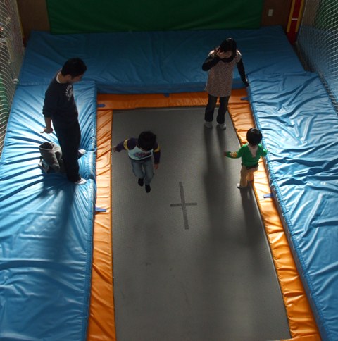 朝から雪で女房も休みなので布団から出るのを止め皆が朝食を食べ孫が起こしに来るまで布団の中に。10時前には息子もやって来て孫達と雪合戦。私と娘は部屋の中です。11時過ぎに息子が大学時代に行っていたと言う神領にあるトランポリン場に行く事に。1面30分1500円。3面有りましたが先客で埋まっていたので20分待ち。見ているだけでは何とかなるものと思っていました。が、やって見ると垂直に跳ねるだけでも思うようになりません。孫はすぐに慣れて何度も跳ねていましたが5回も跳ねると息が切れてしまいます。三半規管が狂ってしまったような不思議な体験でした。病み付きになるかも??事前運動を2階から次男坊も跳ねていました長男はすぐに慣れました何事も見ているだけでは分からないものですね初体験のトランポリンは不思議な感覚でした
